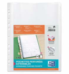 Organisera dina A4-papper och skydda dem mot oavsiktligt spill med dessa utfällbara stansade fickor i polypropylen. Med bälg som kan fällas ut så att de även kan användas för att täcka kataloger och broschyrer. Öppning längst upp Hål: 11 Material: genomskinlig PP-folie Tjocklek: 0,17 mm Färg: Genomskinlig