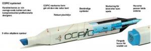 Copic Marker är en lösningsmedelfri och luktfri påfyllningsbar marker med två spetsar i polyester, en tunn spets för detaljer och en bred spets för att fylla snabbt. Copic är perfekt för dig som jobbar med illustrationer eller grafisk formgivning. Marker-pennorna är påfyllningsbara med Copic Various Ink. Spetsarna på Copic Marker är utbytbara. • Copic Architecture 12-set innehåller: C2, C4, E04, E07, E09, E33, E35, E43, E44, YG91, YR02, 100. • Copic Basic 12-set innehåller: R08, YR04, Y13, YG03, G17, B14, B29, B39, V09, RV11, E09, 100. • Copic Bright 12-set innehåller: B06, B29, E37, G07, G16, R08, R27, RV09, V06, Y06, YR07, 100. • Copic Cool Gray 12-set innehåller: C0, C1, C2, C3, C4, C5, C6, C7, C8, C9, C10, 100. • Copic Toner Gray 12-set innehåller: T0, T1, T2, T3, T4, T5, T6, T7, T8, T9, T10, 0 (Blender). • Copic Warm Gray 12-set innehåller: W0, W1, W2, W3, W4, W5, W6, W7, W8, W9, W10, 0 (Blender). • Copic Neutral Gray 12-set innehåller: N0, N1, N2, N3, N4, N5, N6, N7, N8, N9, N10, 110. • Copic Enviroment 12-set innehåller: B05, B14, B26, B18, BG45, BG02, G14, G05, G07, G17, G16, 100. • Copic Pastel 12-set innehåller: Y08, RV34, V12, BV31, B21, B02, BG02, G02, E31, E21, E13, 100. • Copic Skin 12-set innehåller: E00, E04, E11, E21, E35, E37, R02, R20, R32, YR02, 0, 100. • Copic Spring 12-set innehåller: B01, B04, B16, G82, R08, RV13, RV14, Y02, Y21, YG17, YG23, 100. • Copic Summer 12-set innehåller: Y08, R02, R05, RV29, RV19, V17, B32, B26, G19, YG25, E25, 100. • Copic Autumn 12-set innehåller: Y15, Y17, Y38, YR02, YR24, YR18, YG41, E35, E15, E19, E27, 100. • Copic Winter 12-set innehåller: B00, B12, B23, B24, B37, BG11, BV00, BV23, C1, C3, E40, 100.